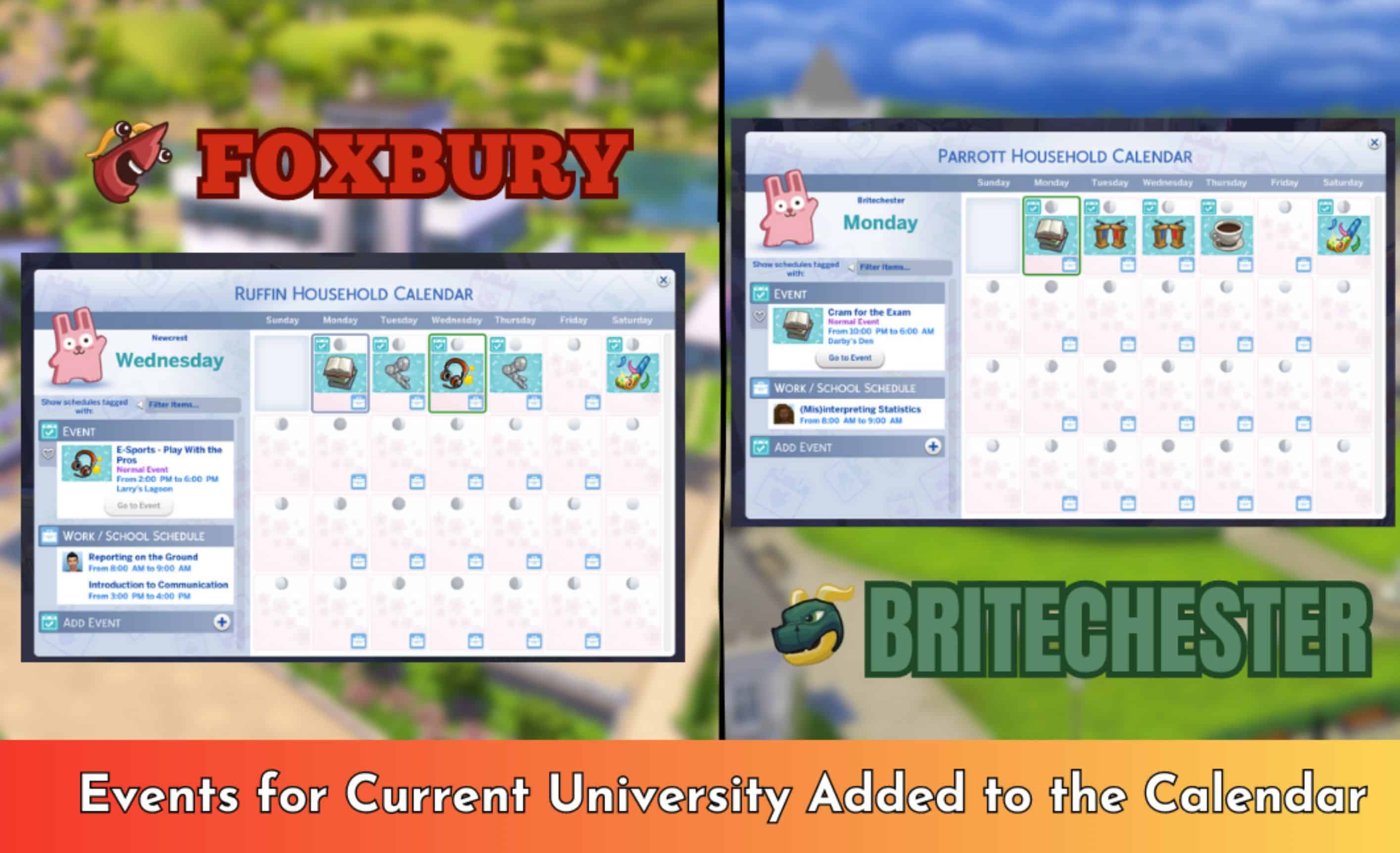 University Events Calendar and Notifications is a mod that adds the events that happen at the university the Sim is attending onto the calendar and gives notifications when the event starts, since in the game, notifications only appear if you are on the lot when the event starts. The events and notifications for Britechester will only appear on the Calendar for any Sims in the Household attending Britechester and the same for Foxbury.