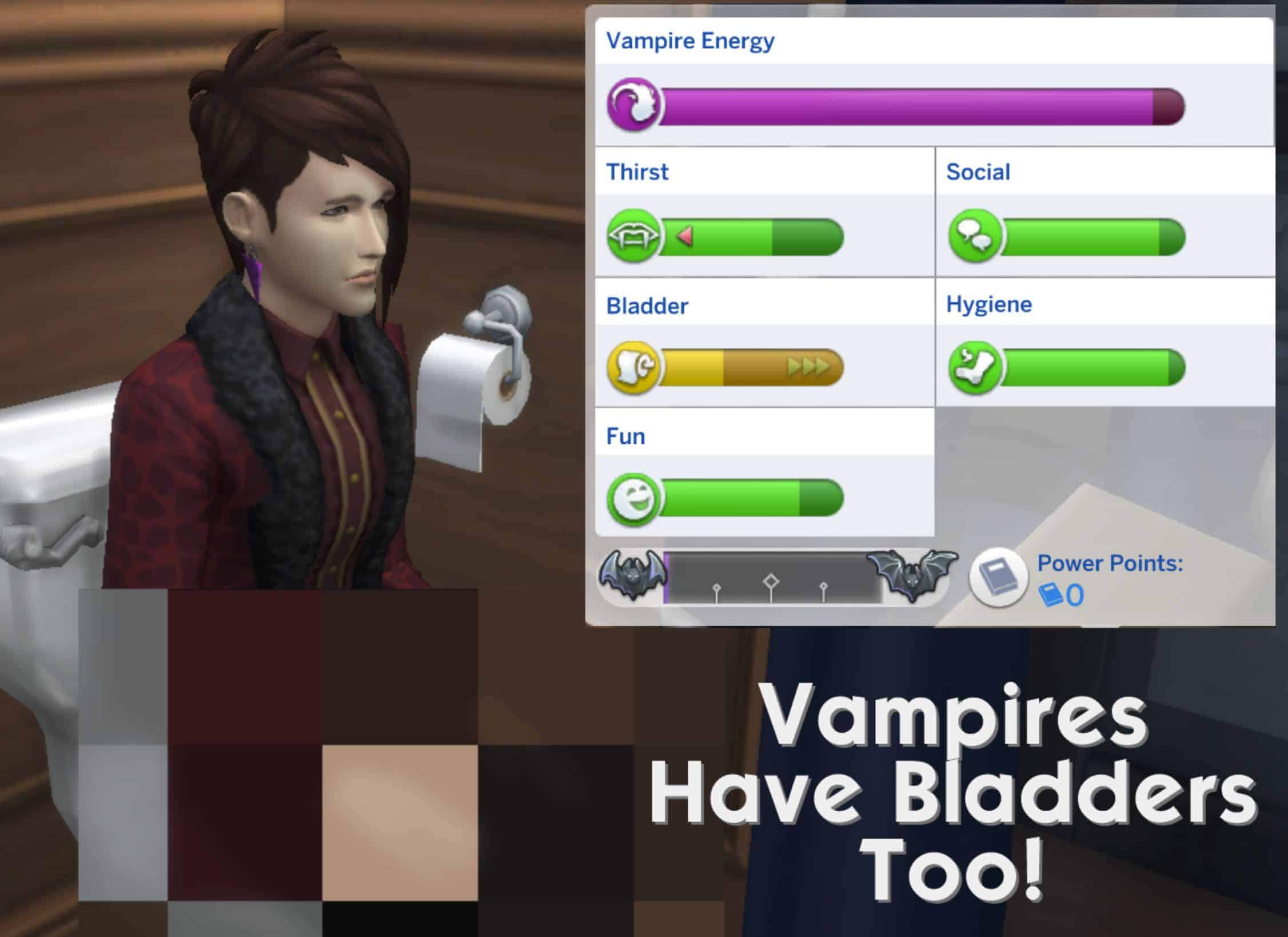 I always thought it was weird that vampire Sims didn’t have a bladder motive, despite their diet being mostly liquid.