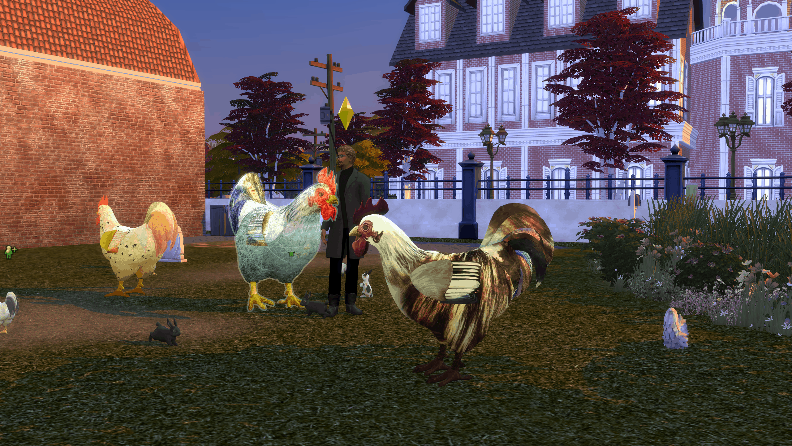 These are 7 different chicken recolors for you to enjoy with your new Cottage Living Expansion Pack! This is my first recoloring I’ve ever done and I had lots of fun with it. I just wanted to make very random variety of chickens. These lean more towards the fantasy look and I like that so I hope you like that too. One is a golden chicken while two of them are of the evil variety! Hope you enjoy! I plan on doing another set of randomly colored chickens in the near future.