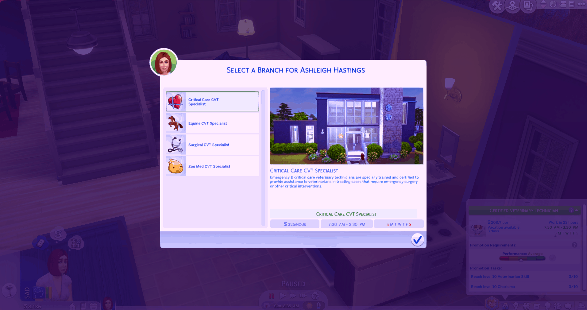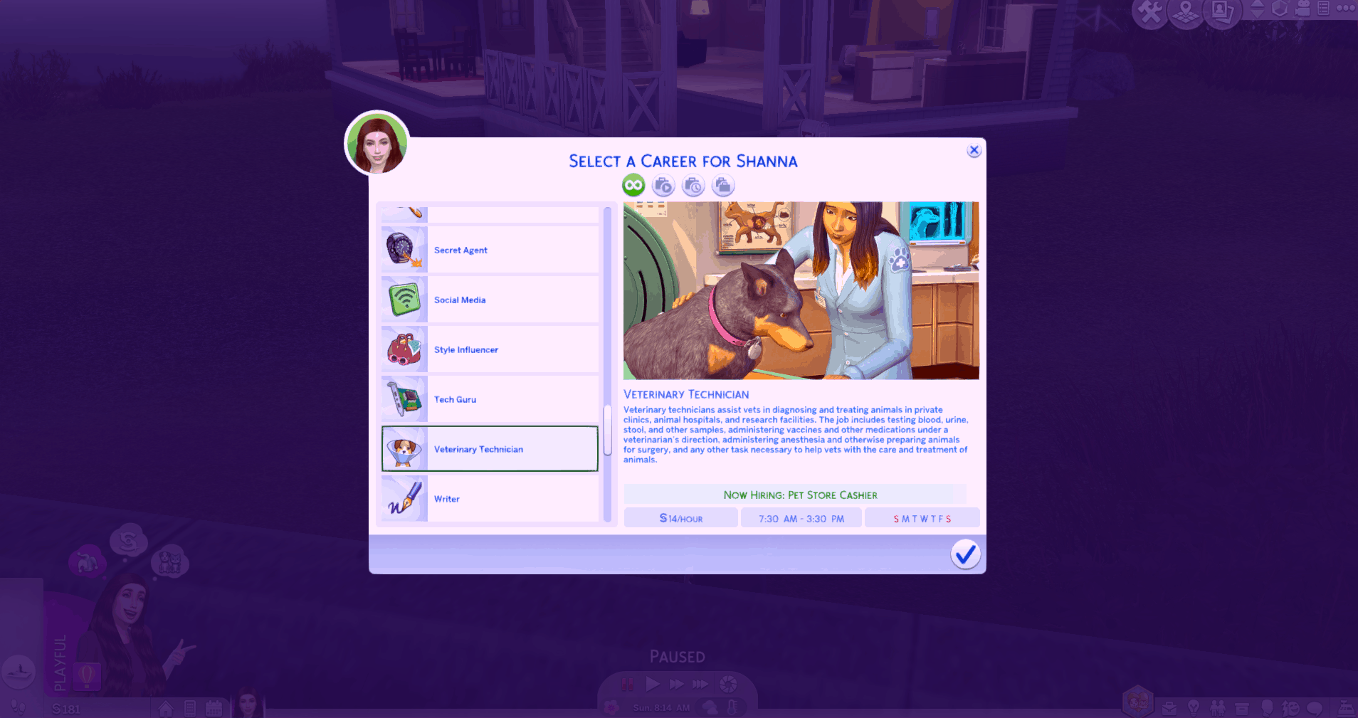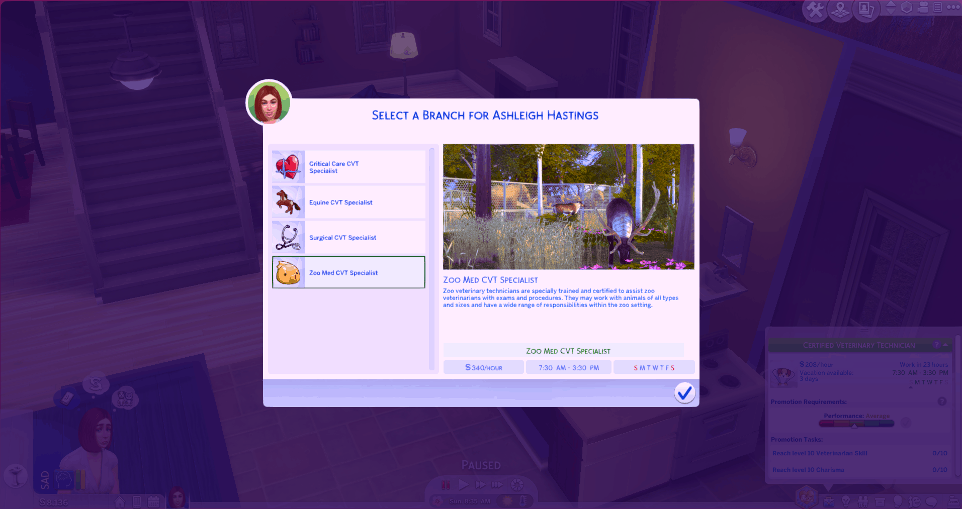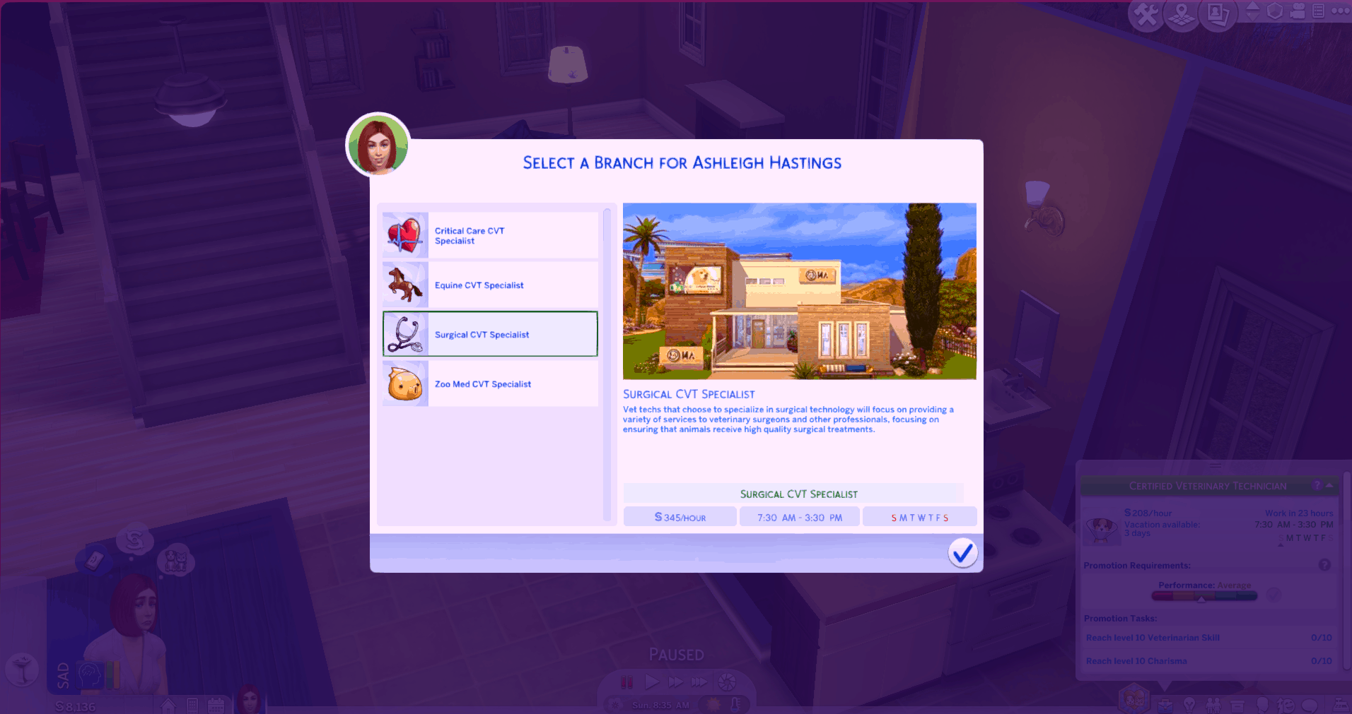 “Veterinary technicians assist vets in diagnosing and treating animals in private clinics, animal hospitals, and research facilities. The job includes testing blood, urine, stool, and other samples, administering vaccines and other medications under a veterinarian’s direction, administering anesthesia and otherwise preparing animals for surgery, and any other task necessary to help vets with the care and treatment of animals.”Hey y’all! I made a new career mod. In real life I am going down the career track to become a veterinary technician so I thought why not make it in the Sims 4 www.sims4modhub.com . I know we already have the vet business lot and someone already made the veterinary rabbit hole career, but I don’t want to be a vet, I just want to be a vet tech! Study Vet Med Interaction