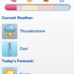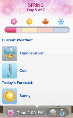 Five new forecasts: Chance of Rain/Storms/Snow, Monsoons (in Sulani, Selvadorada, Strangerville and Oasis Springs), Warm Fog (in Del Sol Valley and San Myshuno). Check the forecast list for more details.