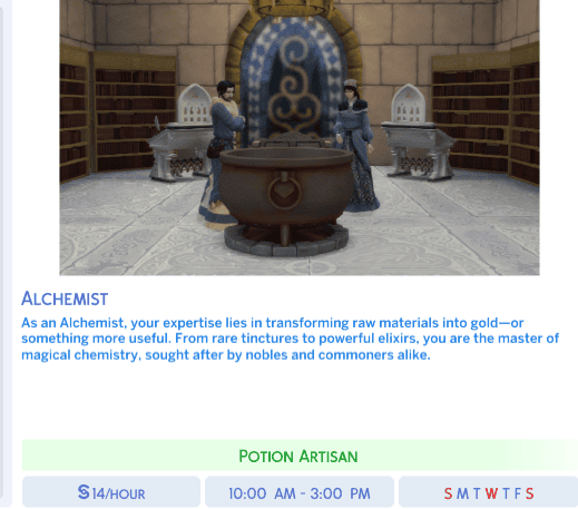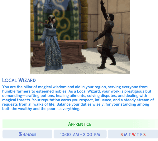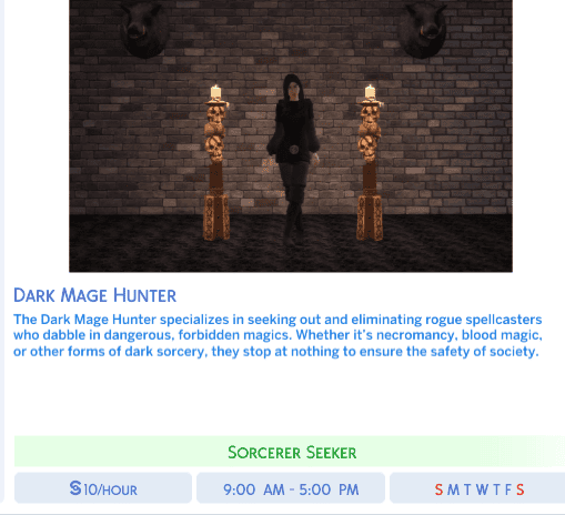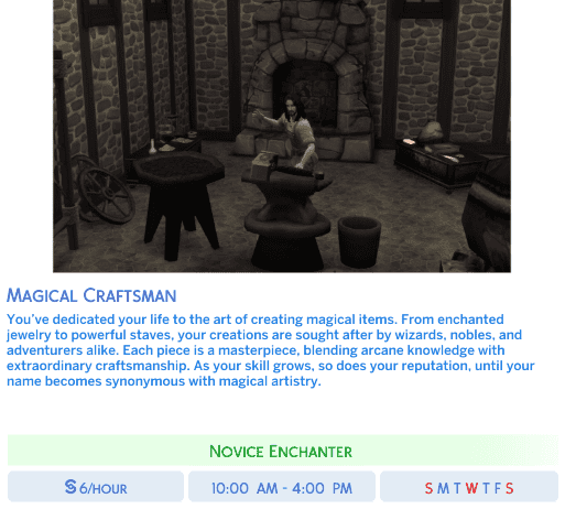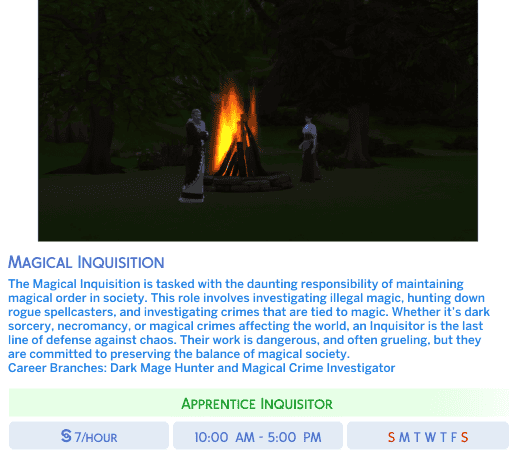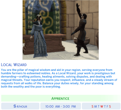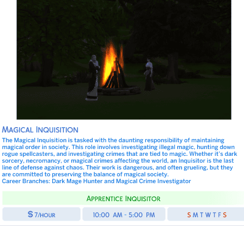 Add exciting new career paths for your magical Sims with Medieval Sorcery Careers! Created by Nika using the Sims 4 Mod Constructor by Zerbu, this mod introduces a variety of enchanting professions perfect for your spellcasters. Whether your Sims are wizards, witches, or alchemists, they now have careers that match their magical talents. Check out the careers in the screenshots and bring a touch of medieval magic to your game! (They weren’t brought up in all branches, just the ones whose images I like the most.)