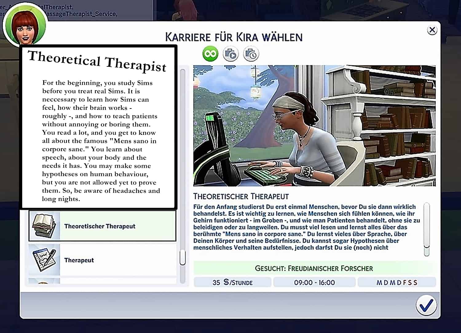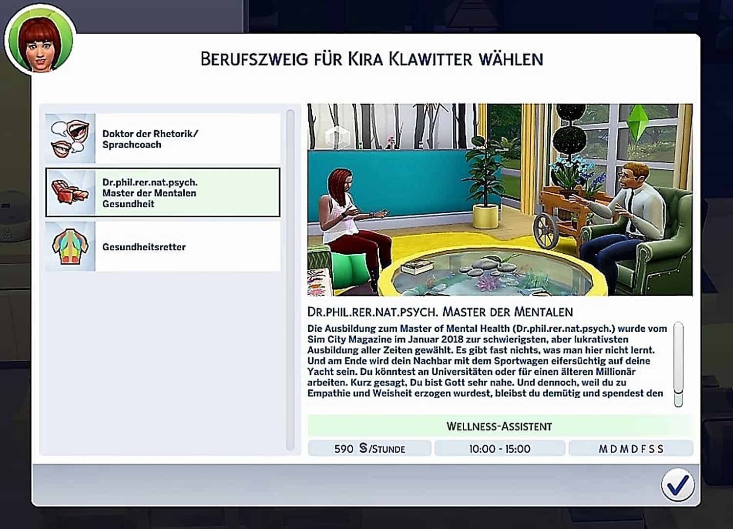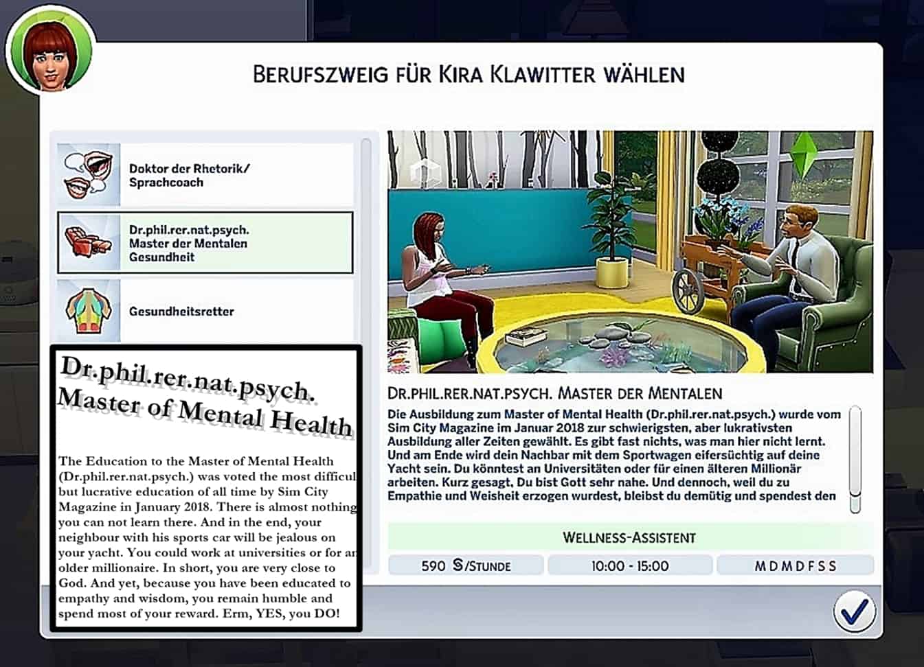 “The Education to the Master of Mental Health (Dr.phil.rer.nat.psych.) was voted the most difficult but lucrative education of all time by Sim City Magazine in January 2018. There is almost nothing you can not learn there. And in the end, your neighbour with his sports car will be jealous on your yacht. You could work at universities or for an older millionaire. In short, you are very close to God. And yet, because you have been educated to empathy and wisdom, you remain humble and spend most of your reward. Not true? You just do not leave your armchair any more. Only if you want.”
