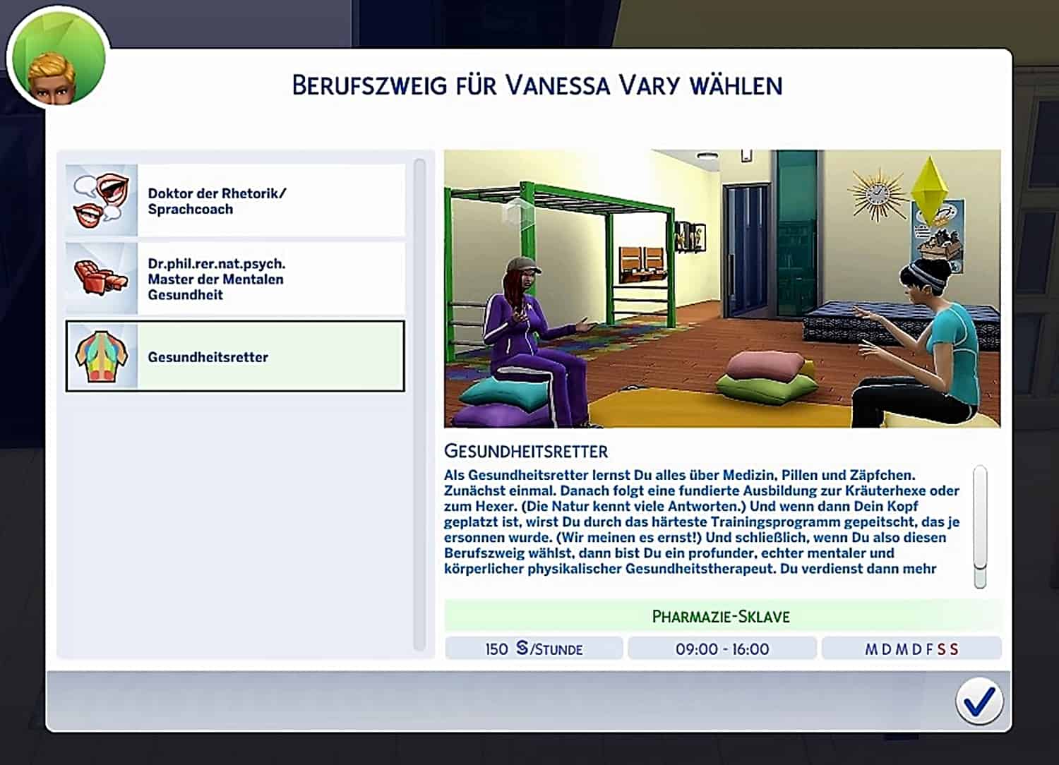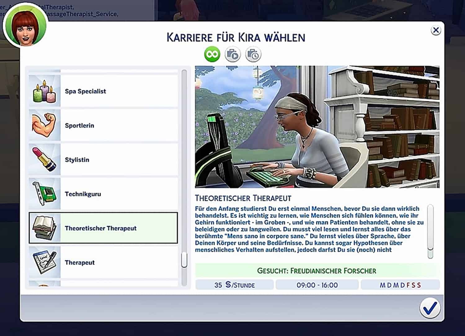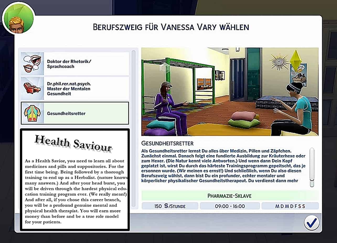“The Education to the Master of Mental Health (Dr.phil.rer.nat.psych.) was voted the most difficult but lucrative education of all time by Sim City Magazine in January 2018. There is almost nothing you can not learn there. And in the end, your neighbour with his sports car will be jealous on your yacht. You could work at universities or for an older millionaire. In short, you are very close to God. And yet, because you have been educated to empathy and wisdom, you remain humble and spend most of your reward. Not true? You just do not leave your armchair any more. Only if you want.”