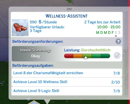 You feel fine. You do feel fine from Monday till Friday from 10 a.m. till 3 p.m. At the same time, you work on Charisma and Logic, and in parallel get your Wellness up to the highest level, because you teach Sims all about Wellness now. Buy yourself a sauna – with fees of 590 Simoleons per hour this won’t be too difficult. Yes, you feel fine, and your clients will profit from that. You probably will regret to be promoted to a