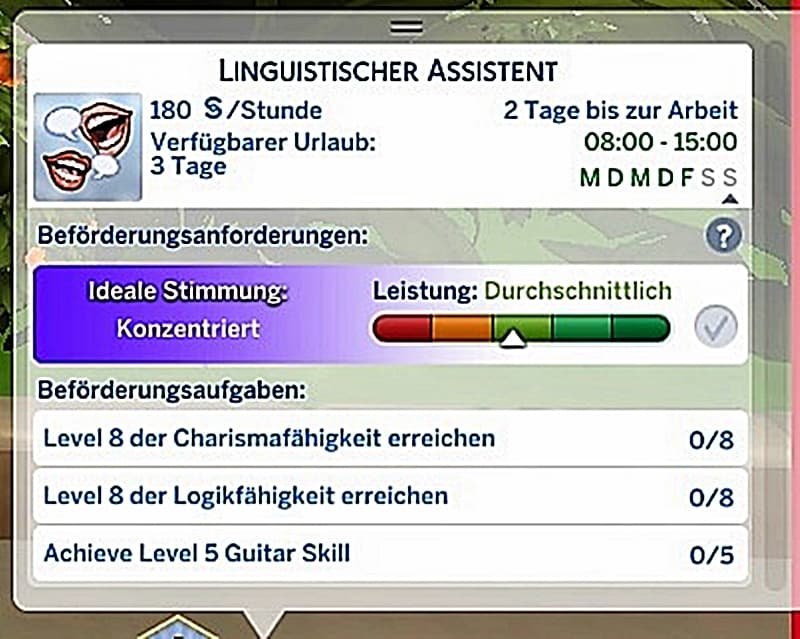 So you focus again, this time on Monday, Tuesday, Thursday and Friday from 9 a.m. to 2 p.m. You’ll need all time to get Level 6 on Charisma, logic and writing! You Analyse speech and talking Sims, you learn phonetics to articulate most properly. So don’t rest too much – you should not for 50 Bucks per hour! Makes it a little bit easier to believe in reaching the aim of your Basic Studies, finally becoming a
