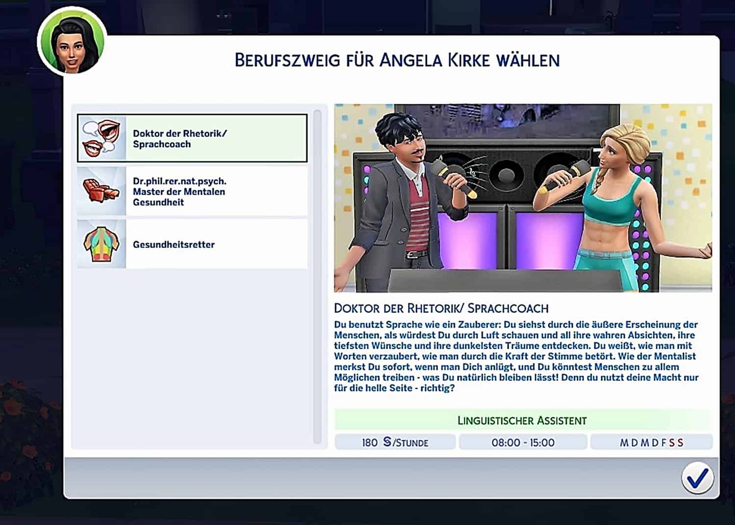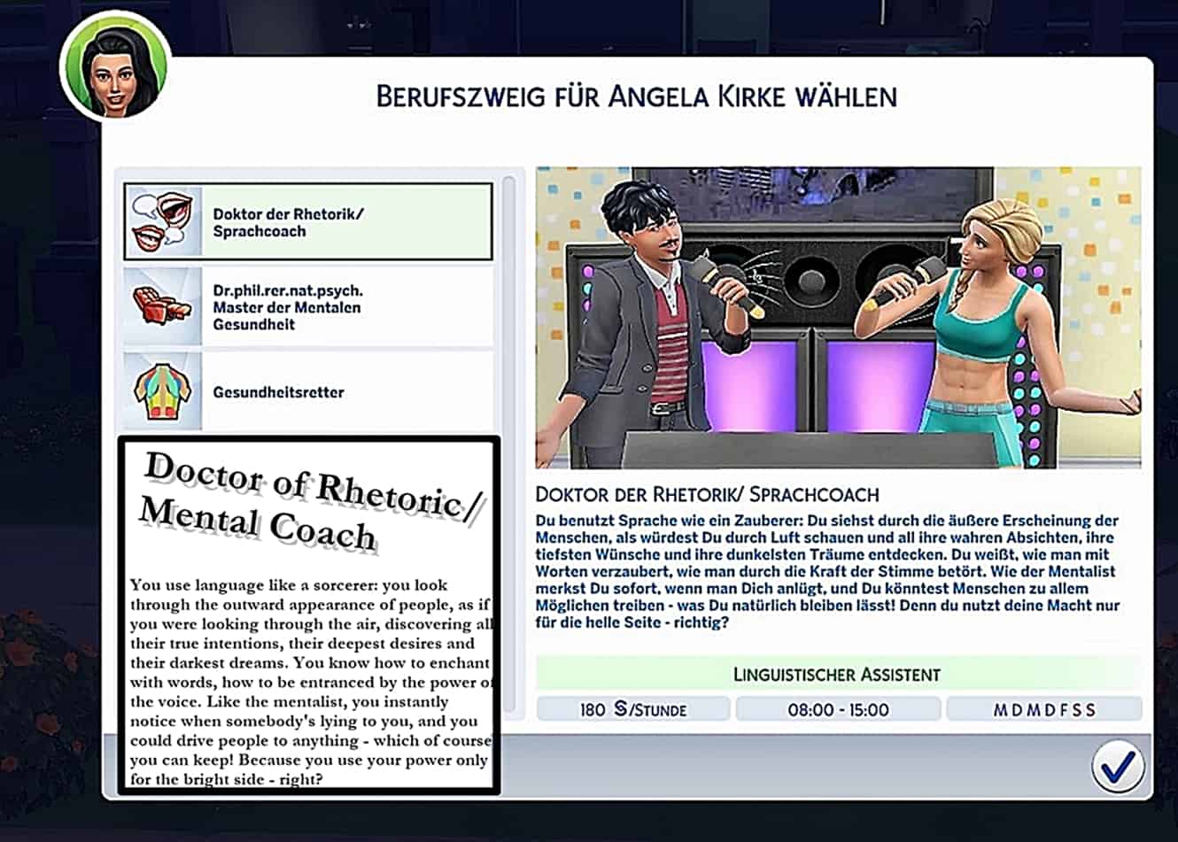 As a studied Doctor, you feel confident rather automatically. You know all about speech, rhethoric, phonetics (how a Sim does speak out a word) and phonology (how a Sim should speak out that word). People come from all over the world to ask you Questions about how to hold their talks, and so on. You work on Monday, Tuesday and Friday from 10 a.m. to 2 p.m., teach at University or at School, and all in all are satisfied with your fees about 930 Bucks per hour – you are worth it, and everybpody knows!