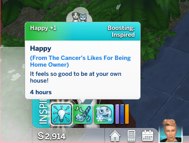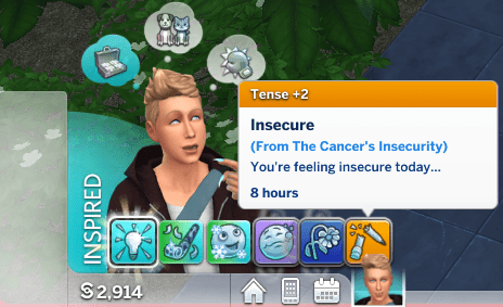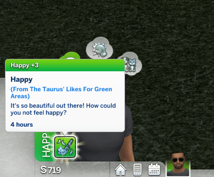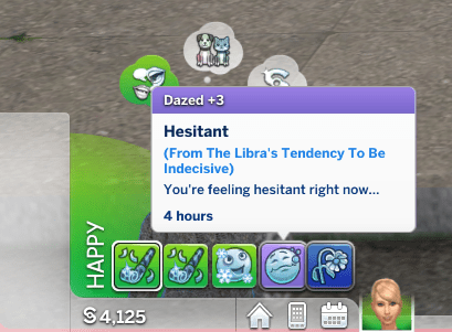 The weights of all your Sim’s negative emotions (dazed, uncomfortable, angry, embarrassed, sad, and stressed) will permanently be decreased by a multiplier of 0.5. Moreover, the weights of all your Sim’s positive emotions (happy, playful, fine, and energized) will permanently be increased by a multiplier of 1.5.
