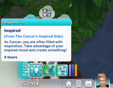 Your Sim will continuously feel happy and focused (emotion weight of 3 for each) while he/she is at work. Your Sim will also continuously feel focused (emotion weight of 3) while he/she is using his/her mental skills (gardening, programming, handiness, logic, rocket science, video gaming, fishing, herbalism, wellness, and archeology). Moreover, your Sim will continuously feel confident (emotion weight of 3) while he/she is wearing a formal outfit, and he/she will also continuously feel happy (emotion weight of 3) while he/she is at a formal venue.