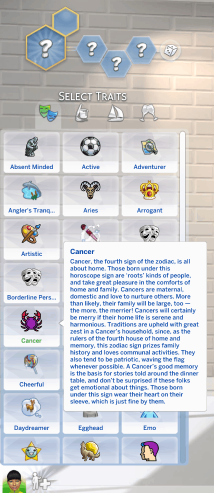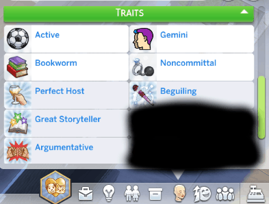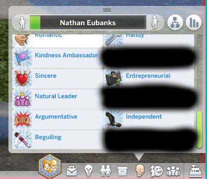 Between 1 and 2 hours from the start, your Sim will get the following personality, gameplay and aspiration traits permanently: Active, Hot-Headed, Sincere, Insider, Ambitious, Self-Absorbed, Independent, Argumentative, Romantic, Self-Assured, Beguiling, Entrepreneurial, Kindness Ambassador, Good, The Knack, and Natural Leader.