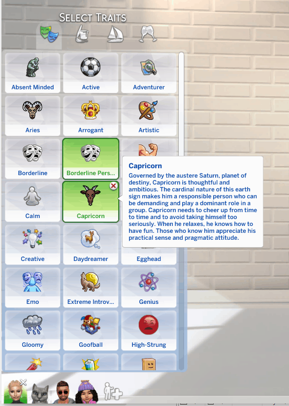 This mod will add the Capricorn custom trait to your game. Please be aware that this trait is only available to young adults, adults and elders. You can find this trait under the Emotional category in CAS.