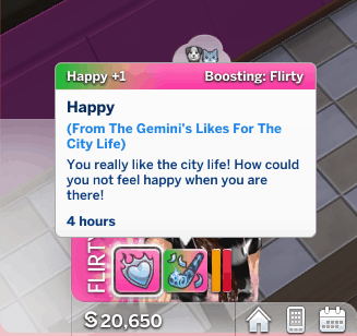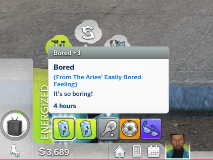 Every 8 to 16 hours, your Sim will have 75% chance to get an Energized buff (emotion weight of 3) for 4 hours. Moreover, every 24 to 48 hours, your Sim will have 75% chance to get a Fearless buff for the preset duration of this buff. And, every 6 to 24 hours, your Sim will get a Bored buff (emotion weight of 3) for 4 hours.