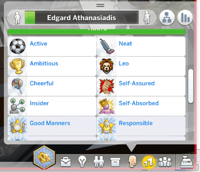 For the commodities and the autonomy, your Sim will permanently get the following: Insider, Neat, Ambitious, Active, Good Manners, Responsible, and Self-Absorbed.