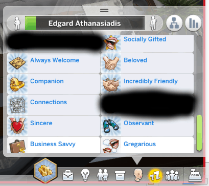 Between 1 and 2 hours after you will have added this custom trait to your Sim, he/she will get the following personality, gameplay and aspiration traits permanently: Insider, Neat, Ambitious, Self-Assured, Active, Sincere, Connections, Observant, Good Manners, Responsible, Always Welcome, Gregarious, Socially Gifted, Cheerful, Companion, Beloved, Self-Absorbed, and Incredibly Friendly.