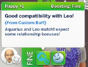 In version 1.1, I’ve added a feature that makes sims get a relationship boost from NPC’s or Townies if their zodiac sign is compatible with each other, they will also get a +1 happy proximity buff named :